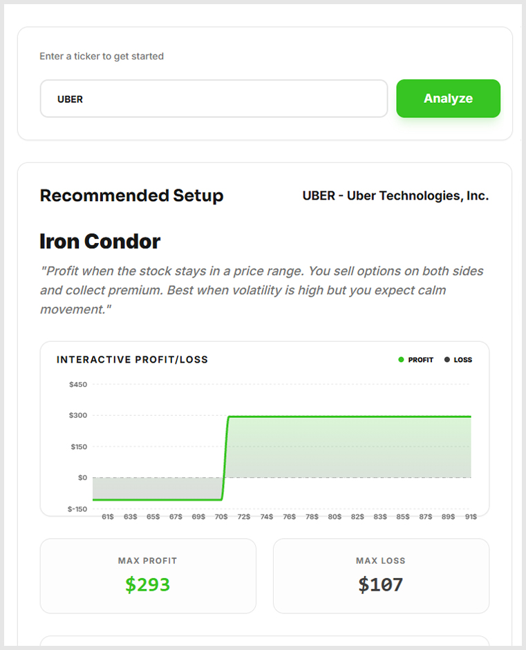 Enter any stock ticker and get the best options strategy to implement, plus detailed step-by-step instructions for executing it in your brokerage account