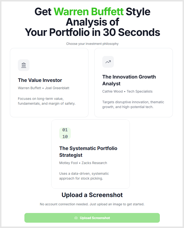 Upload a portfolio screenshot and get Warren Buffett or Ray Dalio-style investment analysis of your holdings with specific recommendations.
